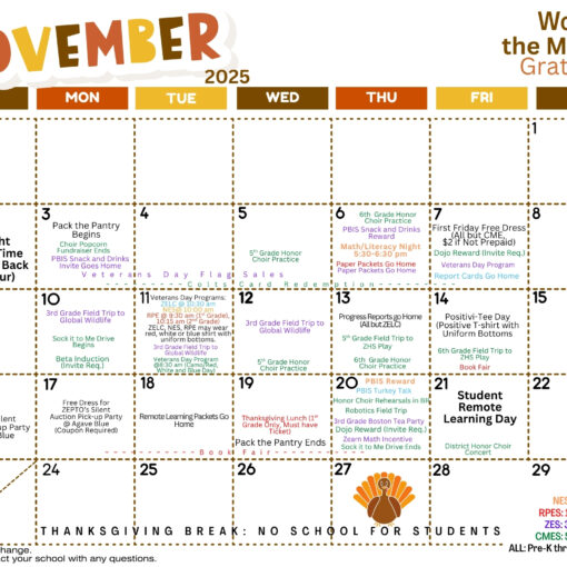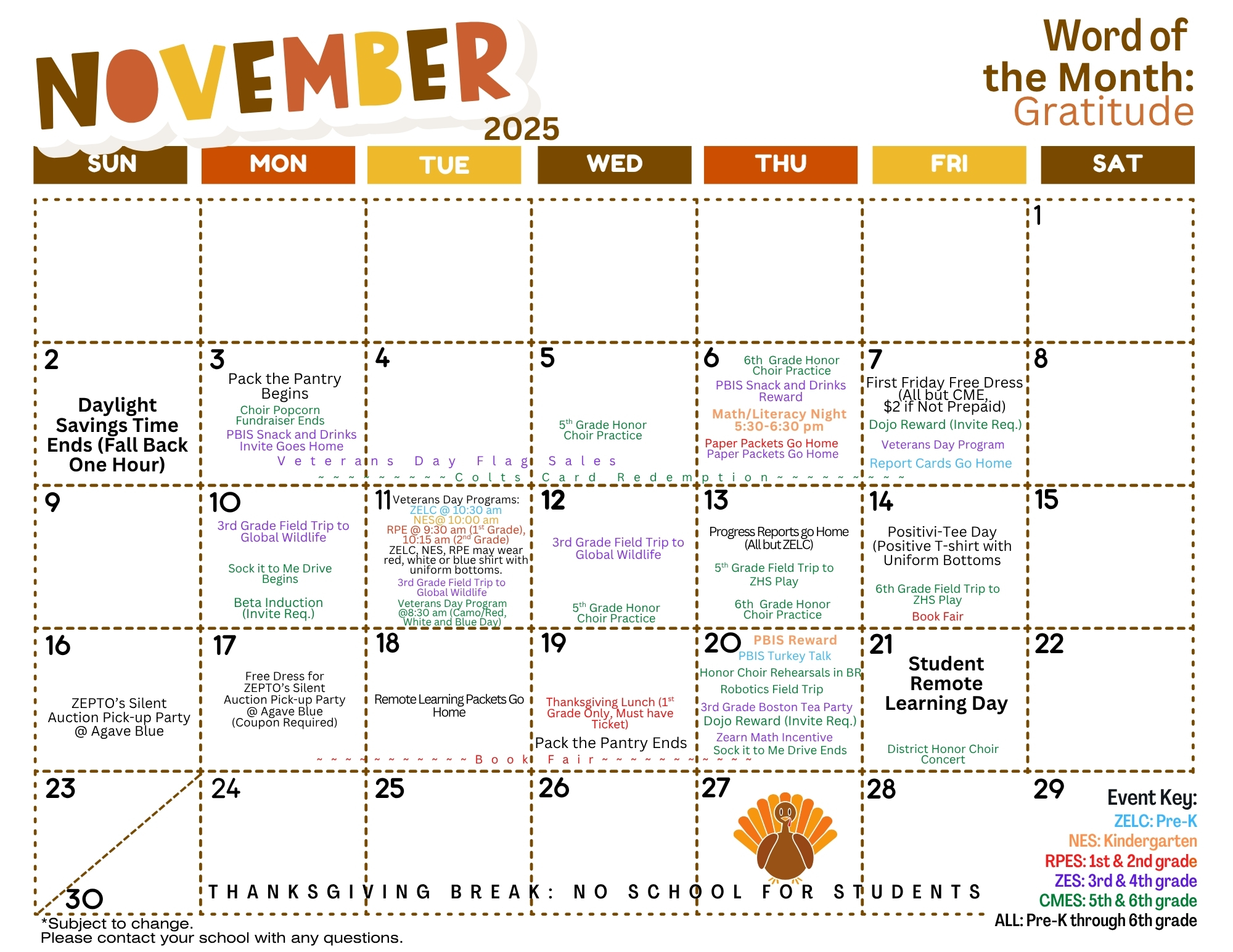 Parents: Please use our Pre-K through 6th grade activities calendar as a quick reference for the month of November.#WeAreZachary