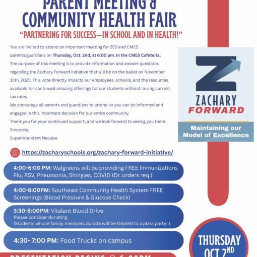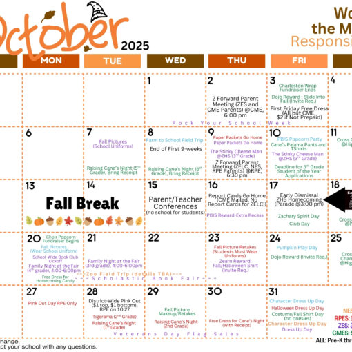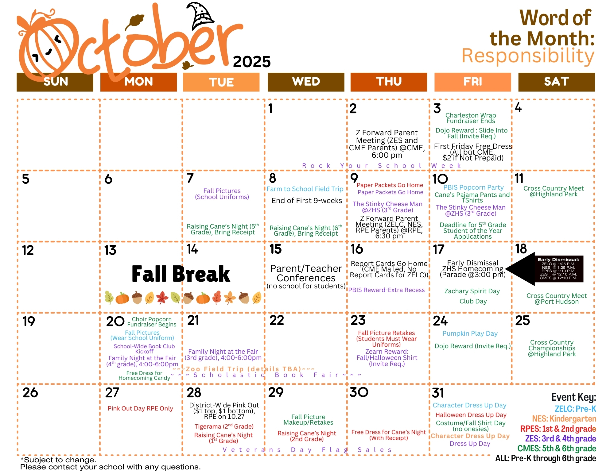Parents: Please use our Pre-K through 6th grade activities calendar as a quick reference for the month of October.#WeAreZachary